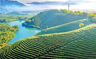 风吹茶田,翠浪翻涌,一片片碧绿的西湖龙井茶叶,正书写着茶产业传承与发展的鲜活篇章。