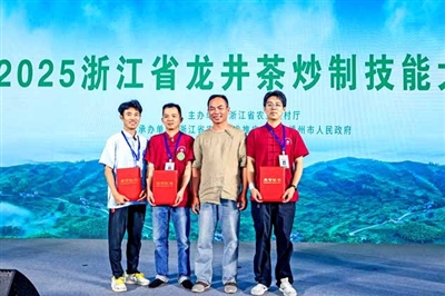 在近日举行的2025年浙江省龙井茶炒制技能大赛上,来自转塘街道上城埭村的俞华平与陈亚荣,分别获得“炒制能手”和“青年炒制能手”的称号。