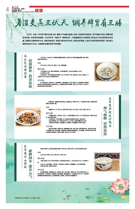 三伏天,正值一年中阳气最为旺盛之时,暑湿之气也最为强盛,此时人体新陈代谢加快,阳气浮越于体表,脾胃功能相对较弱,且易受湿邪侵袭。三伏天养生,关键在于“健脾祛湿”。本期健康版为大家推荐三款适合三伏天食用的养生药膳,药膳均以健脾食材为主,搭配其他食材,兼顾口感与养生功效。食用这些药膳,让我们在享受美食的同时,轻松度过潮湿闷热的三伏天,以健康的体魄迎接季节的更替。