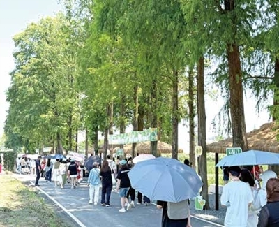 8月初的后陡门,近500亩稻田中弥漫着新稻丰收的喜悦,80亩向日葵昂起饱满的花盘,160余棵水杉笔直挺立,被晚霞染成温柔的橘粉色。田埂上,穿着潮牌的年轻人三三两两,把洞洞鞋踩进松软的泥土里,还不时举起手机打卡拍照。