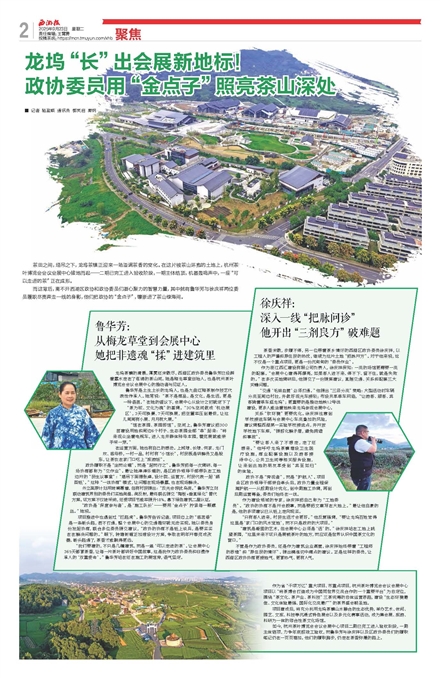而这背后,离不开西湖区政协和政协委员们凝心聚力的智慧力量,其中就有鲁华芳与徐庆祥两位委员履职尽责奔走一线的身影,他们把政协的“金点子”,镶嵌进了茶山绿海间。