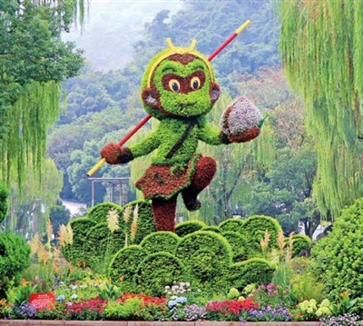 日前,杭州灵山景区新添一座高达5米多的“悟空”主题植物立体花坛。该立体花坛雕塑主体以中国古典神话人物孙悟空为原型,巧妙地运用各类植物进行立体裱扎。这座“悟空”雕塑造型别致、憨态可掬,一经亮相,便成为景区内的新晋“网红”打卡点,吸引大量游客驻足拍照。