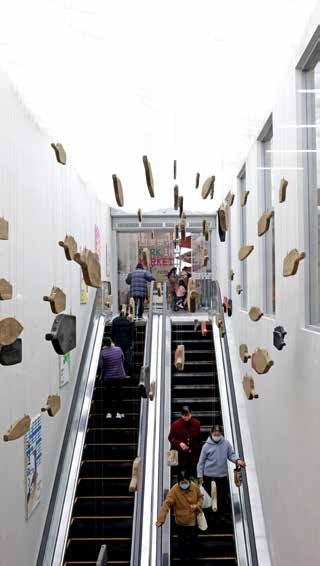 比如在西溪菜市的入口及一楼休闲区,引入了西溪湿地名片之一的芦苇。站在西溪菜市一楼至二楼的扶梯上,抬头便能看见碧波之上鱼群如云,与二楼刚好形成鱼跃龙门的景象,让人一秒走进西溪湿地,眼中尽是江南鱼米之乡“丰”光。