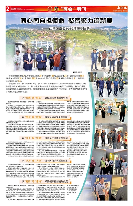 围绕打造银发经济西湖模式、加快建设‘阅读第一区、高质量打造未来社区开展专题协商。针对生态环境综合治理、基本公共教育服务供给、特殊教育水平提升开展重点调研。紧盯老旧小区物业提升、青年夜校品牌建设、社区“微托育”机构发展等开展民主监督。围绕2025年度区政府民生实事项目实施开展协商式监督,提出意见建议90条,就2026年为民办实事项目向政协委员、界别群众广泛征求意见19条。