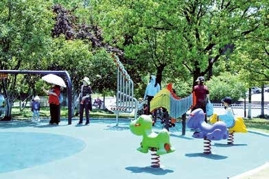 嘉绿苑小游园里,暖阳透过香樟树的缝隙,洒在蓝白相间的沙坑上。几个孩子蹲在地上翻转“数字滚筒”,笑声清脆;一旁的坐凳上,年轻妈妈们一边欣赏风景,一边闲聊家常。这个藏身于小区间的共享公园不过数百平方米,却成了附近几十户家庭几乎每日必到的“公共客厅”。